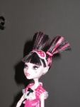 Draculaura имеет заостренные уши, клыки и черно-розовые волосы, которые связаны в два конских хвоста.